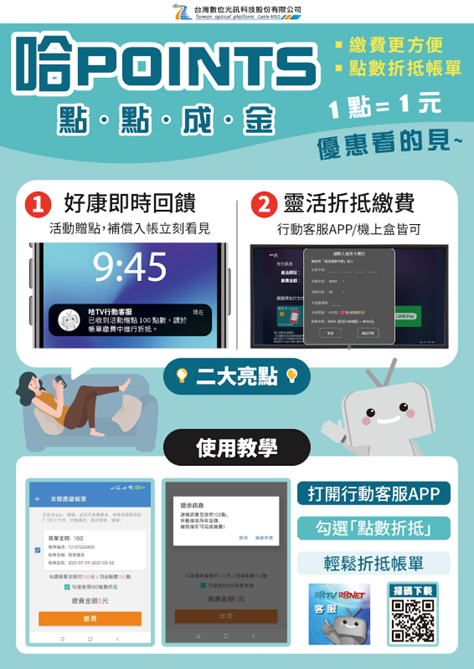 全品項折抵: 可直接折抵高速光纖網路費、有線電視或多元影音服務費用。