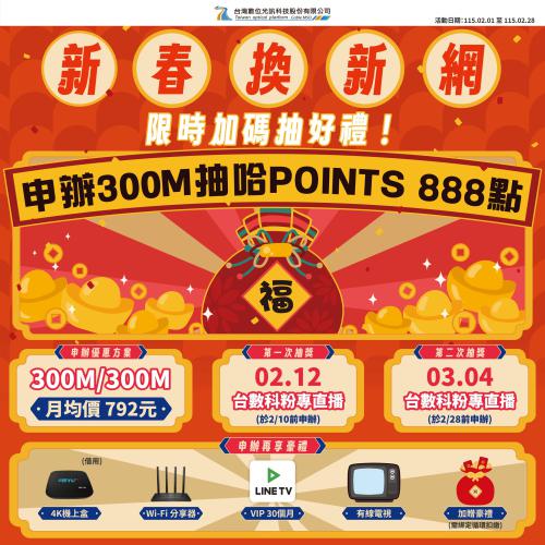 新年網速大升級,開春手氣旺! 即日起申辦指定【新春換新網・300M】光纖上網方案,不僅享受飆速體驗,還有機會將 888 點 哈POINTS 帶回家。雙波段抽獎,越早申辦機會越多!